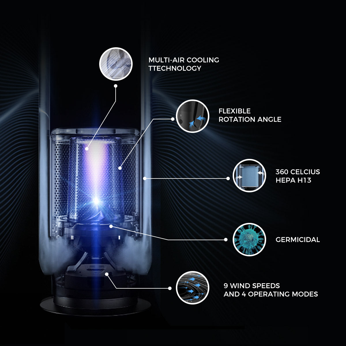 360° perfect sealed tech+ Air circulation technology + Replaceable HEPA-Filter make this desk fan achieve air purifier function. Let you enjoy a cleaner fresh breeze and healthier-room.