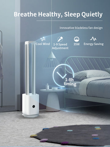 - Lower Noise, More Serenity: Ultty bladeless fan adopts a unique air-duct design with fluid mechanics and minimize noise. Brings a comforting, cool, and ultra-quiet breeze, the LED dims after 2 mins while 8 H timer kicks off, giving you 12 hours of good sleep or deep nap at a noise lower to 32dB.